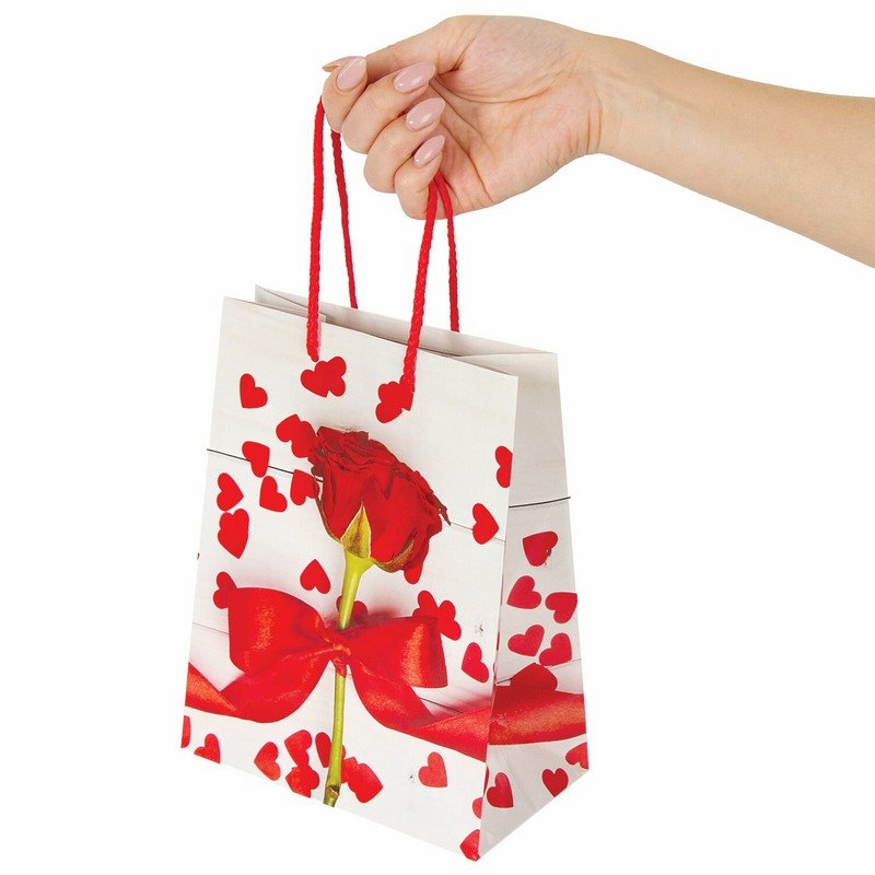 Подарочный пакет, как и все виды подарочной упаковки, способен придать особый статус подарку, также он является достаточно практичным изделием, которое может использоваться в повседневной жизни. Изготовлен из ламинированной мелованной бумаги с веревочными ручками из полипропилена. Размер 17,8x9,8x22,9 см. Пакет выполнен в белых и красных тонах с изображением красной розы, украшенной лентой.