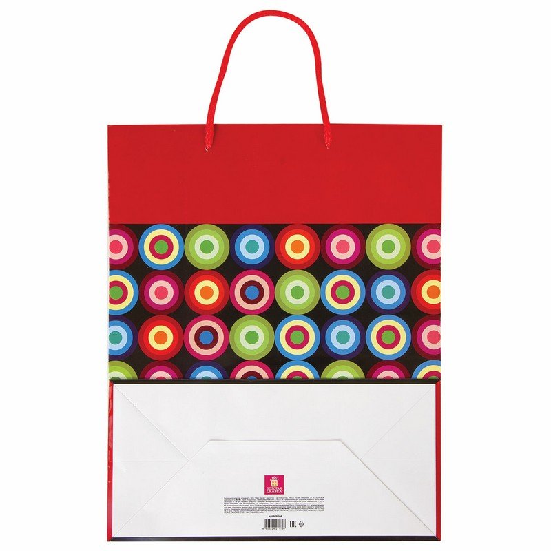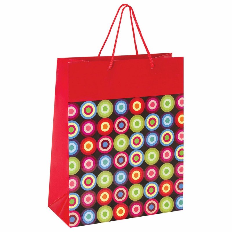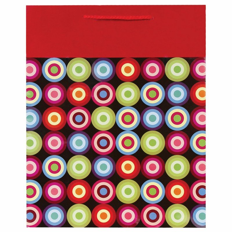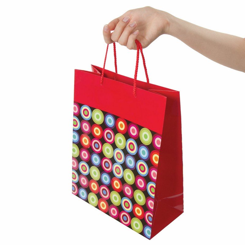 Подарочный пакет, как и все виды подарочной упаковки, способен придать особый статус подарку, также он является достаточно практичным изделием, которое может использоваться в повседневной жизни. Изготовлен из ламинированной мелованной бумаги с веревочными ручками из полипропилена. Размер 26x12,7x32,4 см. Пакет с ярким принтом в виде разноцветных кружков выполнен в красном цвете.