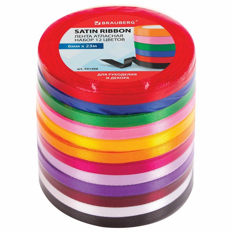 Лента атласная ширина 6 мм, набор 12 цветов по 23 м, BRAUBERG, 591498