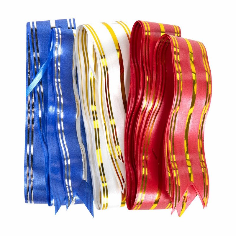 Набор состоит из 3-х бантов-шаров в трех цветах с металлизированными полосами - красный c золотистыми полосами, синий с серебристыми полосами, белый с золотыми полосами. Ширина ленты - 5 см, длина ленты в разобранном виде - 157 см. Банты выполнены из прочного полипропилена (80%) и полиэтилена (20%). Диаметр банта в собранном виде около 15 см. Банты поставляются в разобранном виде. Для того, чтобы собрать бант, необходимо расправить ленту, найти на одном из концов ленты две тонкие ленточки и тянуть за них, пока бант не примет свой окончательный вид. Банты упакованы в прозрачный пакет с картонным подвесом, на оборотной стороне которого находится краткая информация о товаре.