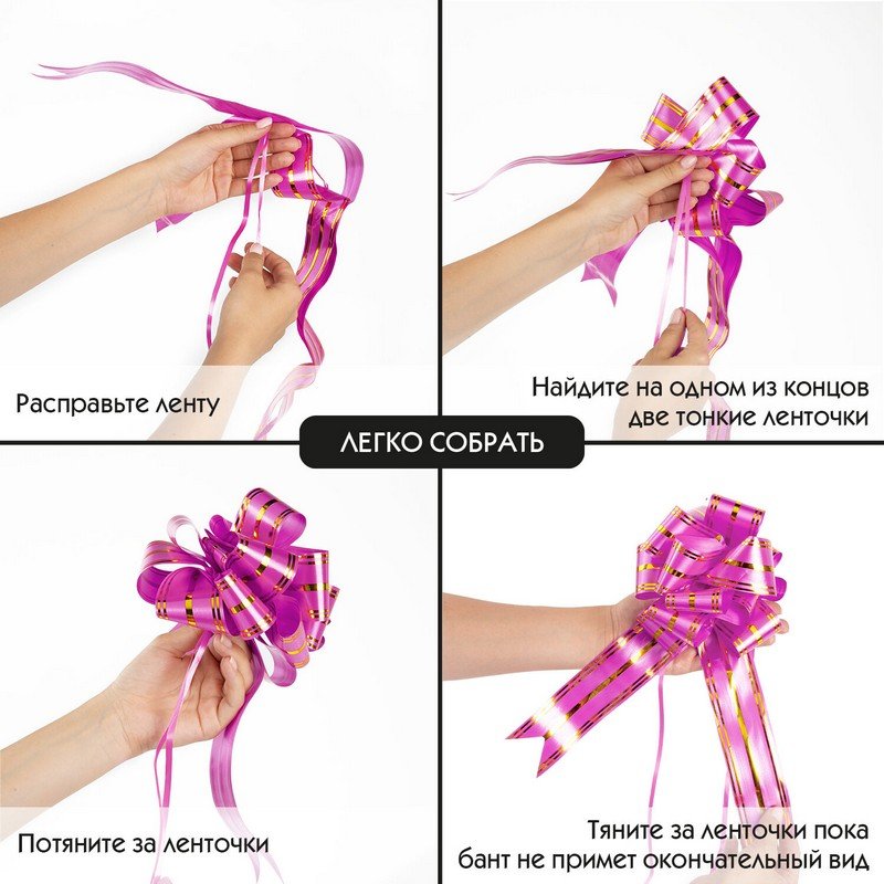 Набор состоит из 3-х бантов-шаров в трех цветах с золотыми металлизированными полосами - фуксия, бирюзовый, зеленый. Ширина ленты - 5 см, длина ленты в разобранном виде - 157 см. Банты выполнены из прочного полипропилена (80%) и полиэтилена (20%). Диаметр банта в собранном виде около 15 см. Банты поставляются в разобранном виде. Для того, чтобы собрать бант, необходимо расправить ленту, найти на одном из концов ленты две тонкие ленточки и тянуть за них, пока бант не примет свой окончательный вид. Банты упакованы в прозрачный пакет с картонным подвесом, на оборотной стороне которого находится краткая информация о товаре.