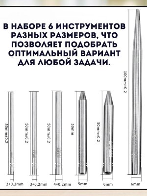 • В наборе представлено 6 инструментов разных размеров, что позволяет подобрать оптимальный вариант для любой задачи.