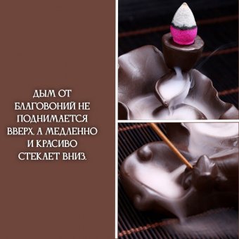 • Эффект «стелющегося дыма» - дым от конусообразных благовоний не поднимается вверх, а грациозно струится вниз, наполняя чашу подставки таинственным туманом. Это завораживающее зрелище, которое успокаивает и создаёт атмосферу медитации.