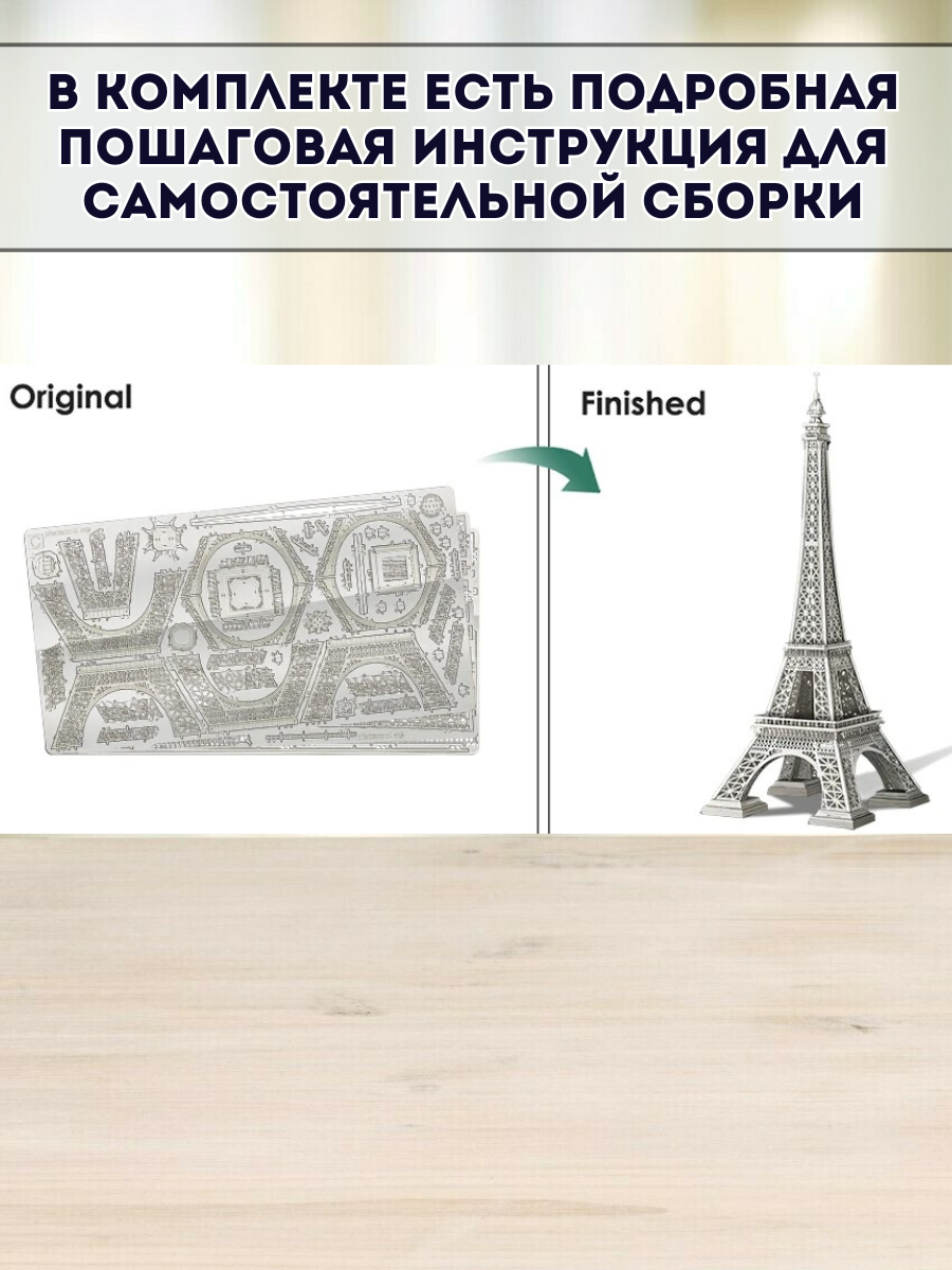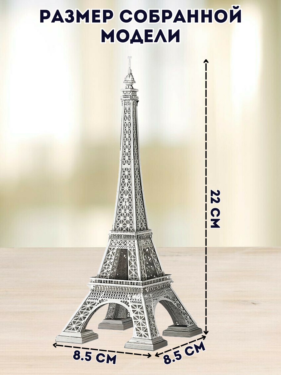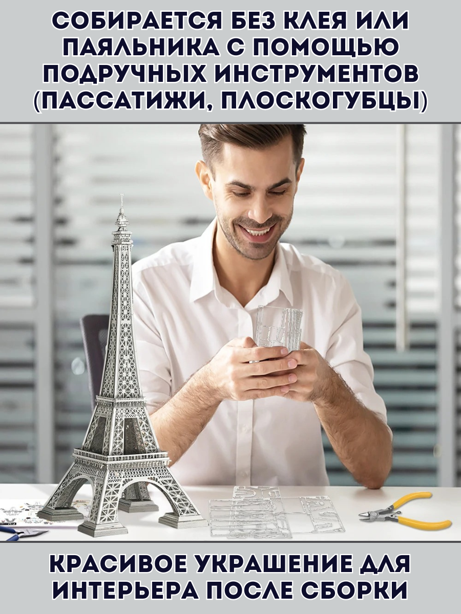Конструктор 3D пазл металлический "Eiffel Tower" Luxury Gift. Эйфелева башня - самая знаковая достопримечательность Парижа. Башня с кованой решеткой на Марсовом поле была построена в 1889 году и названа в честь инженера Гюстава Эйфеля, чья компания спроектировала и построила башню. Эйфелева башня, построенная в ознаменование 100-летия Французской революции и Всемирной выставки 1889 года, возвышается над рекой Сеной и привлекает около 7 миллионов посетителей в год. Пазл способствует развитию мелкой моторики, мышления, тренирует память и воображение. 3д пазлы требуют внимания и усидчивости при соединении частей.