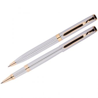 Идеальный подарочный набор в подарок деловому человеку: шариковая ручка, диаметр пишущего узла - 1,0 мм и ручка роллер, диаметр пишущего узла - 0,6 мм. Цвет корпуса - серебристый, с рифлением. Отделка - золотистого цвета. Изящная гравировка.